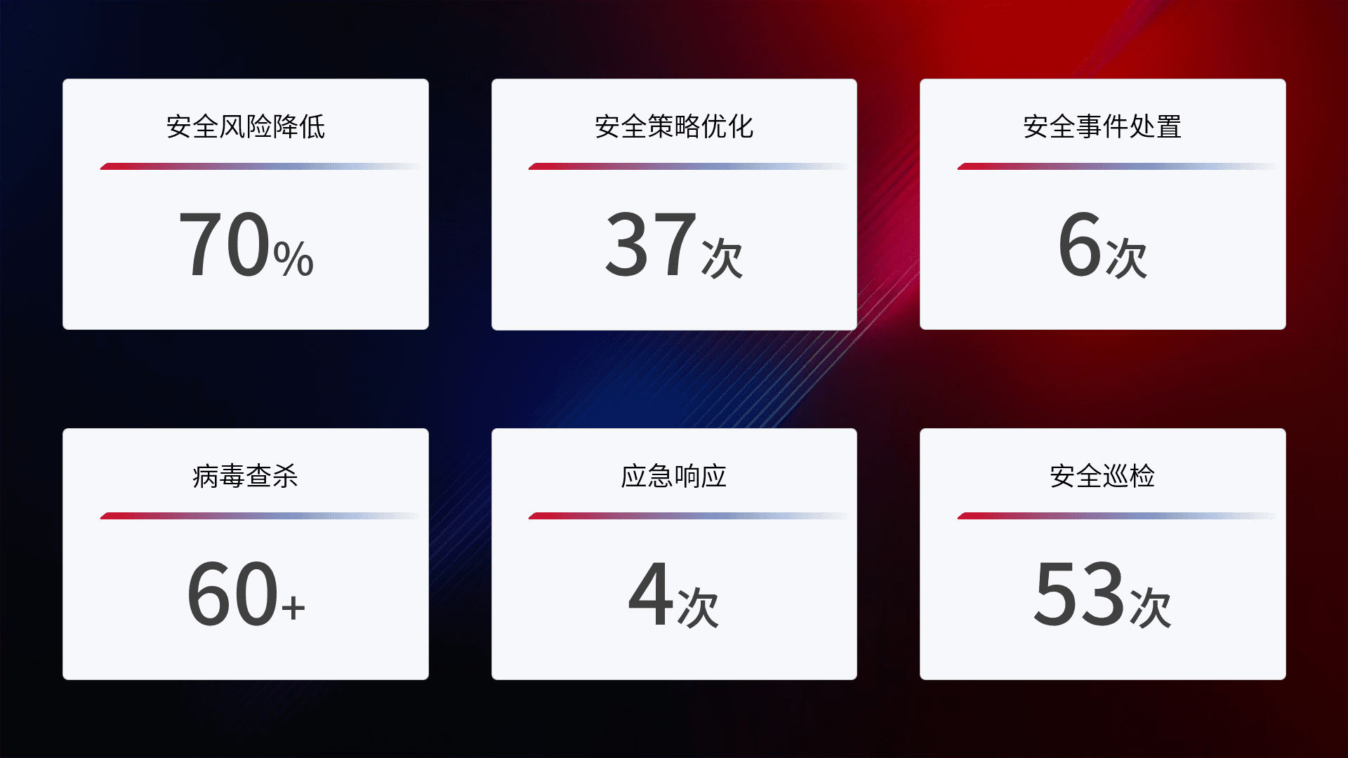 提供全面的安全事件报告体系,,包括处置报告、、、周报、、、、季度和年度总结,,,,结合持续监控,,,,帮助客户深入了解网络安全状况。。